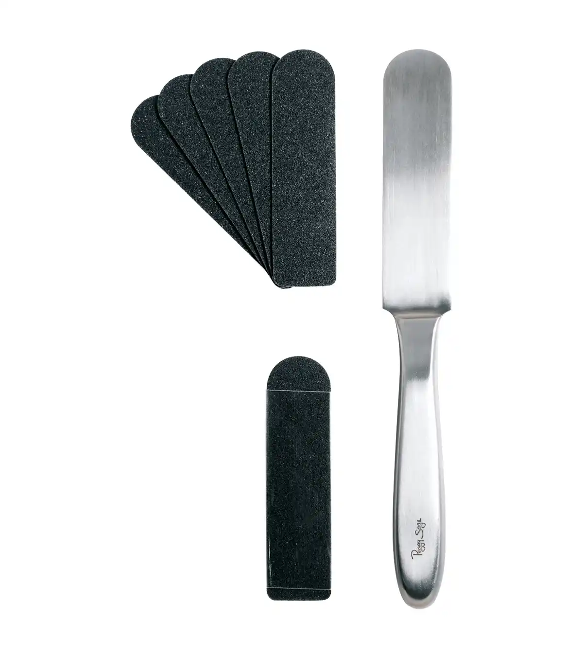 La râpe inoxydable peut être désinfectée au stérilisateur ou manuellement à froid , les émeris adhésifs se changent après chaque utilisation. Ainsi tout risque de contamination par mycose est évité. Contient deux types d’émeris (fin et standard).